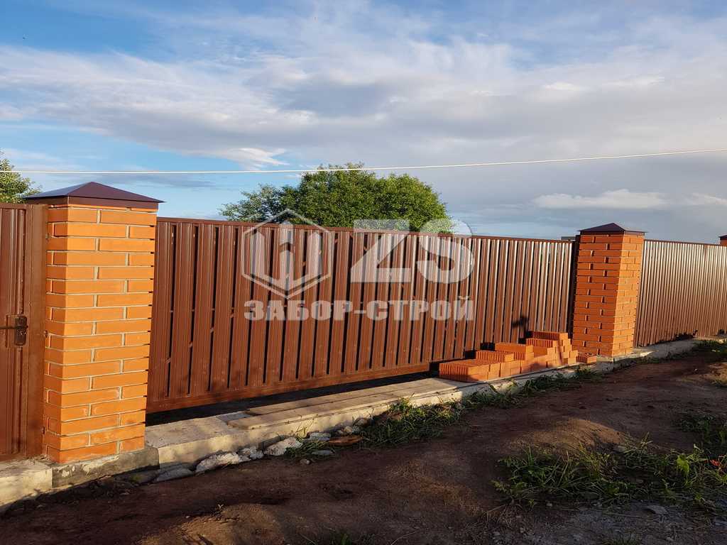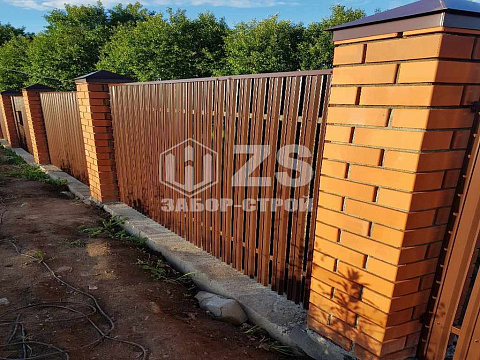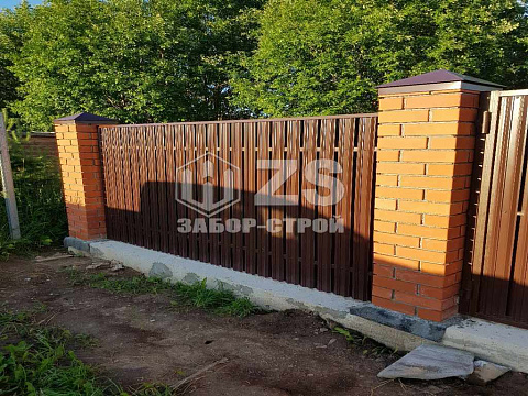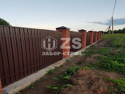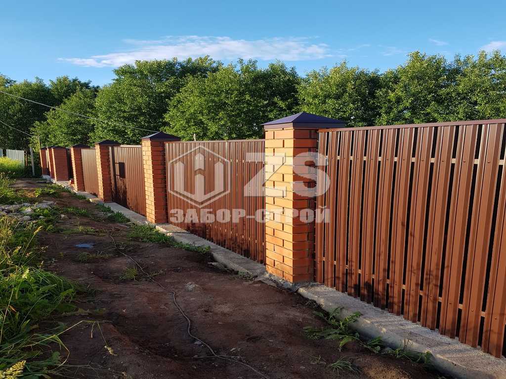 - Забор с кирпичными столбами из евроштакетника 30 метров