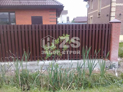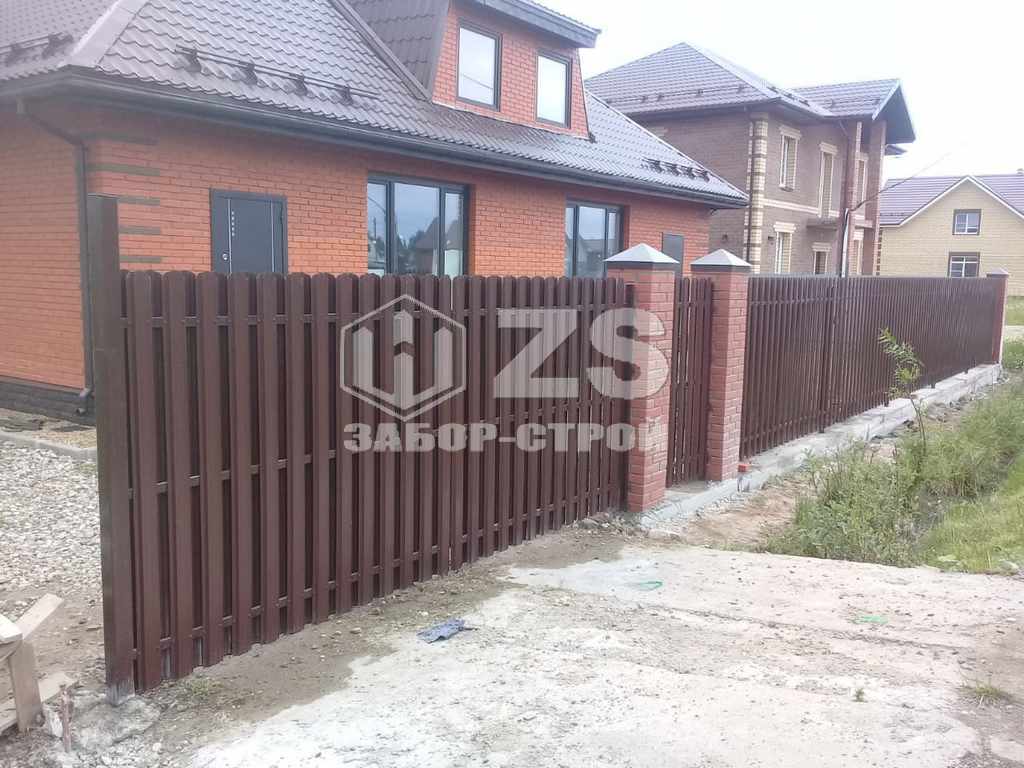 - Забор с кирпичными столбами из евроштакетника 35 метров